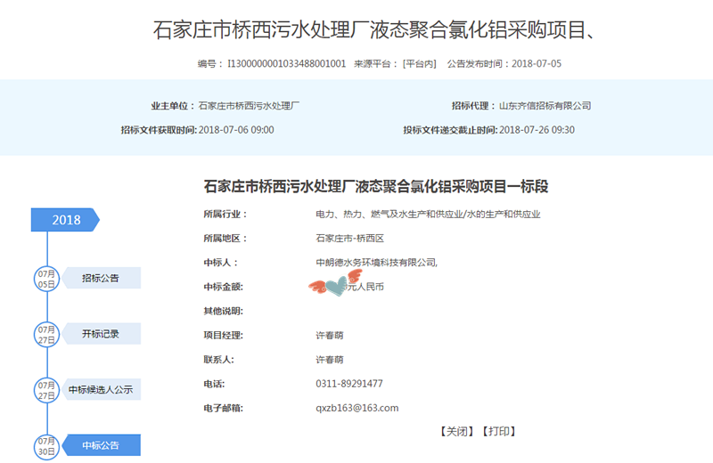 熱烈祝賀公司在《石家莊市橋西污水處理廠液態聚合氯化鋁采購項目》中標!