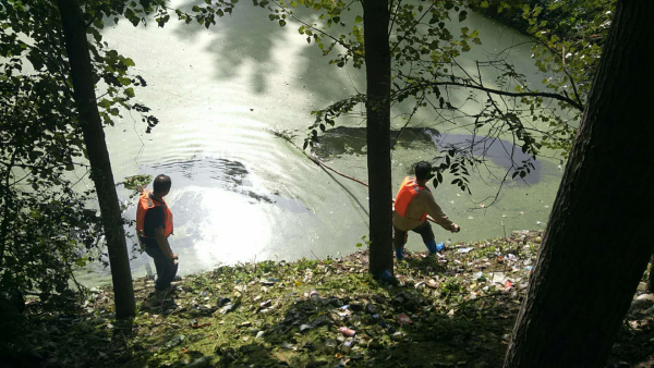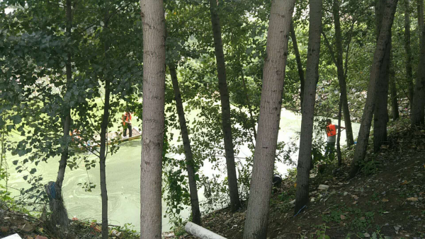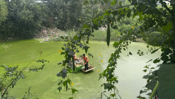 2018年9月2日至9月7日之間工人在岸邊和船上利用網子將水體表面的浮萍打撈起來集中運走處理。