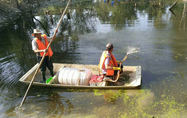 2018年9月11日至9月13日期間工人用泵向水體內進行生物藥劑噴灑。
