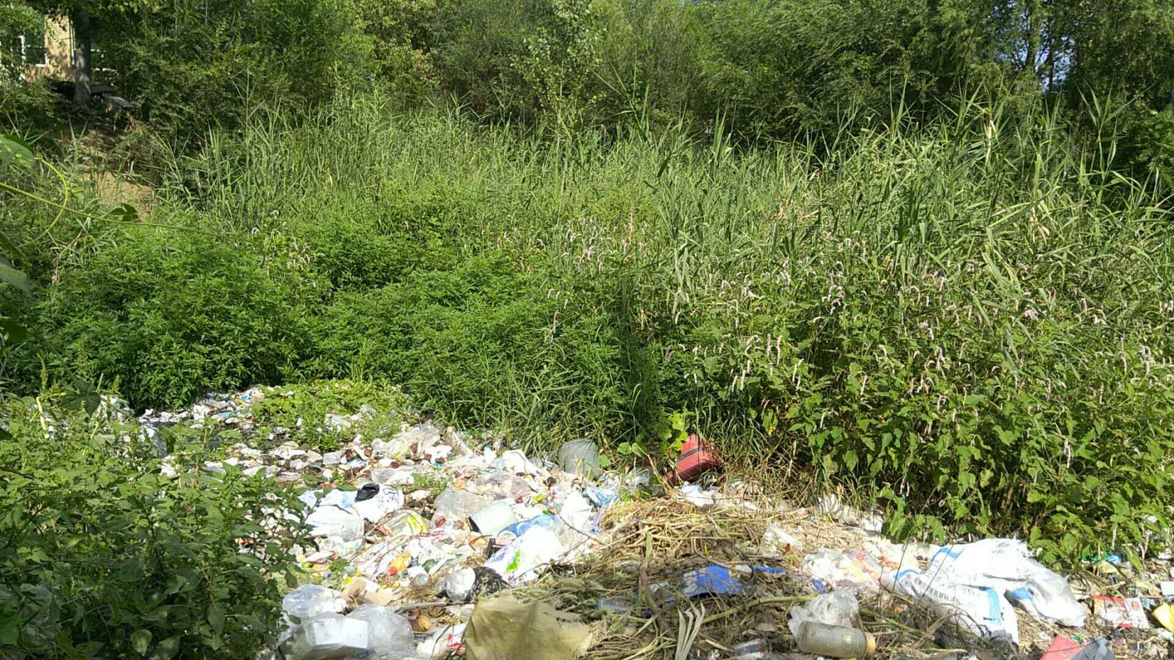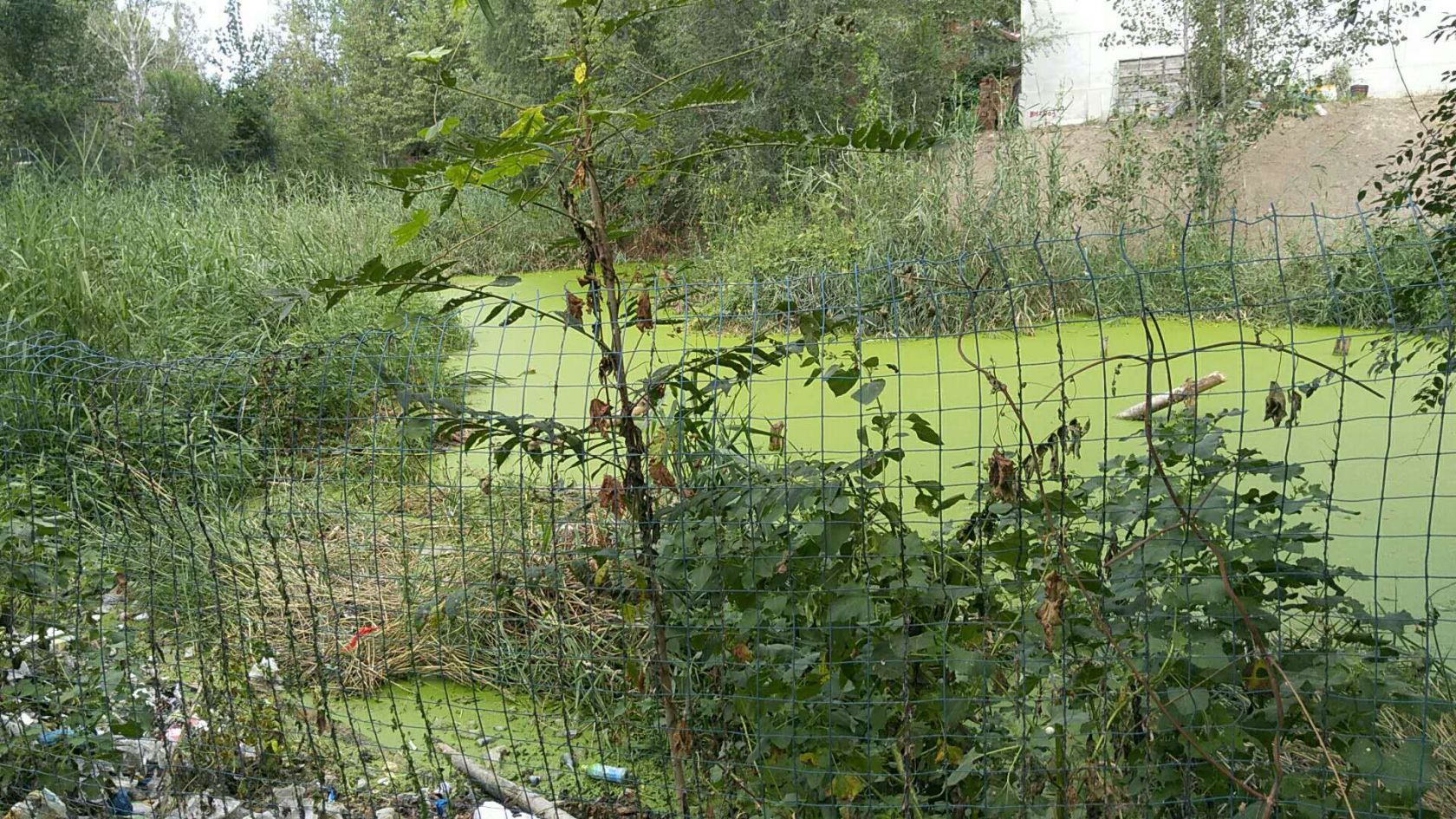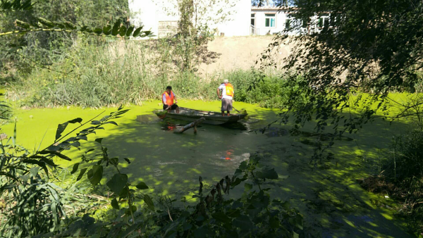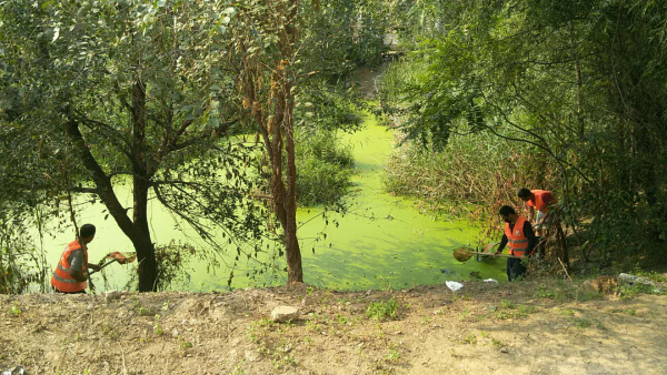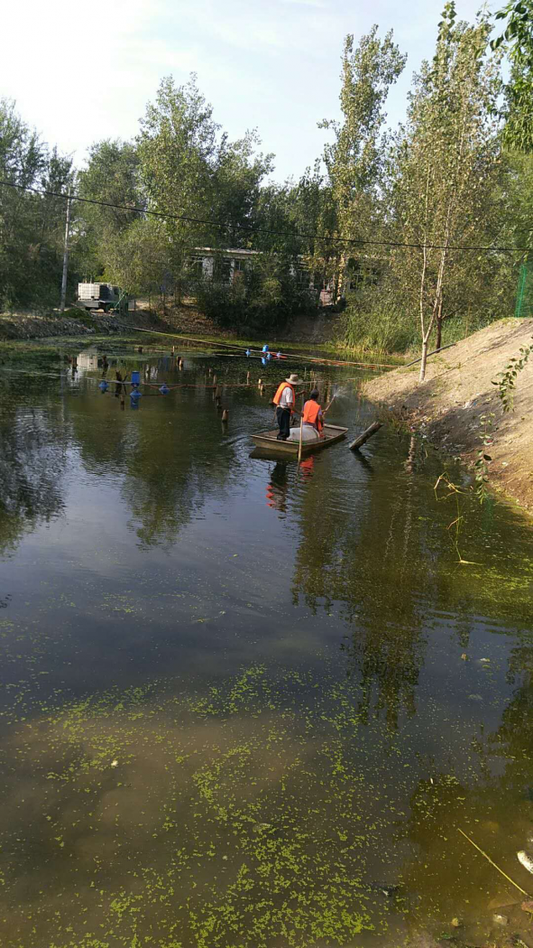 2018年8月28日至2018年9月1日期間工人在岸邊和船上利用網(wǎng)子將水體表面的浮萍打撈起來集中運走處理。