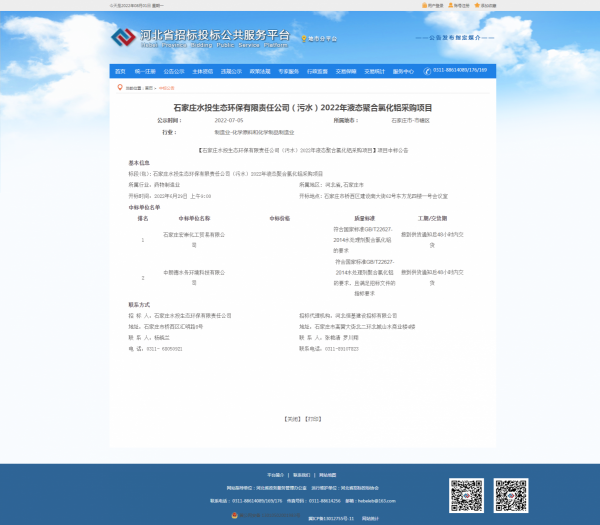 熱烈祝賀中朗德水務環境科技有限公司于2022年06月29日在石家莊水投生態環保有限責任公司(污水)2022年液態聚合氯化鋁采購項目的投標活動中,一舉中標!