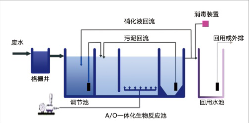 醫療廢水一體化處理設備基本型由六部分組成:(1)格柵井(2)調節池(3)A/O一體化生化池(4)MBR膜池(5)消毒池,消毒裝置(6)風機房組成。